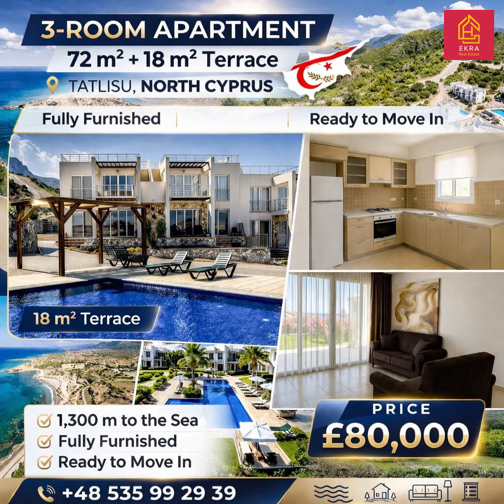 Na sprzedaż komfortowe, w pełni umeblowane mieszkanie 2+1 o powierzchni 72 m² z dużym tarasem 18 m², położone w jednym z najpiękniejszych kompleksów mieszkaniowych Cypru Północnego.