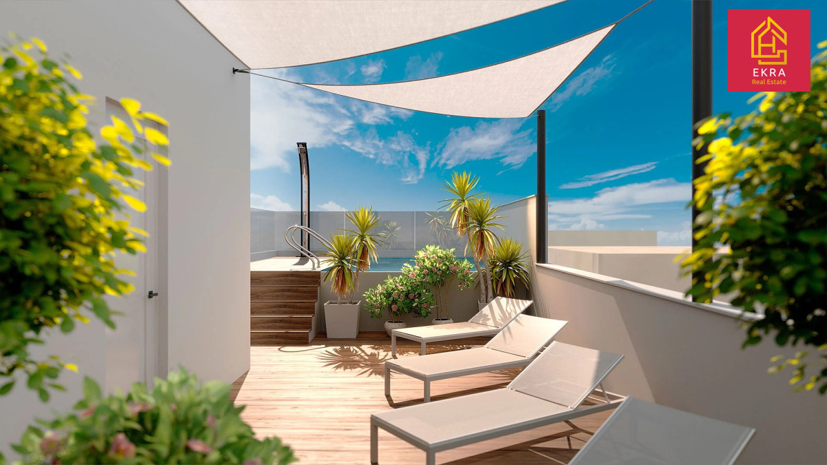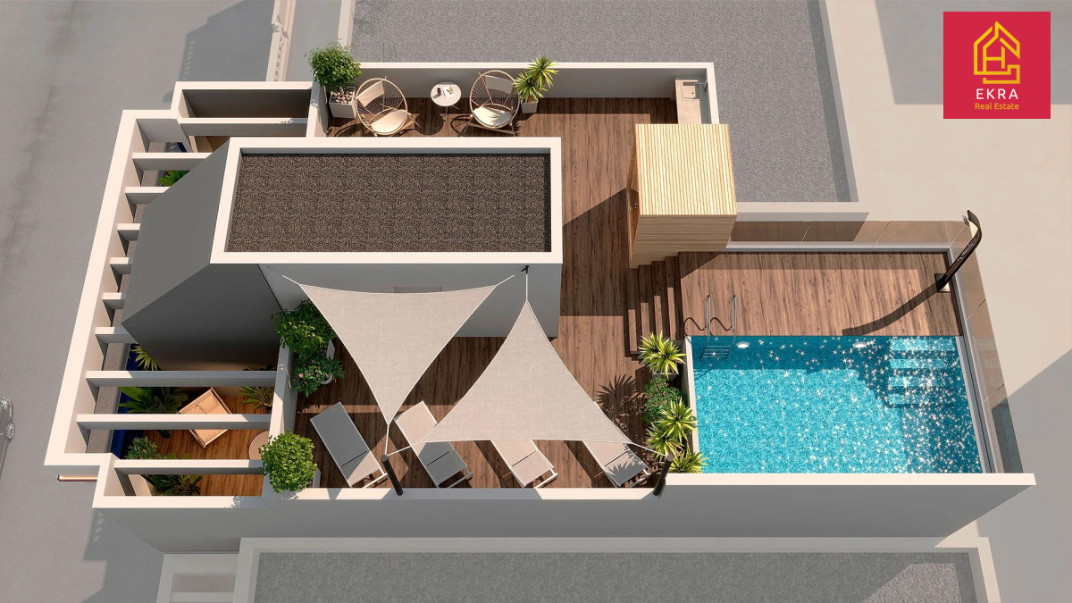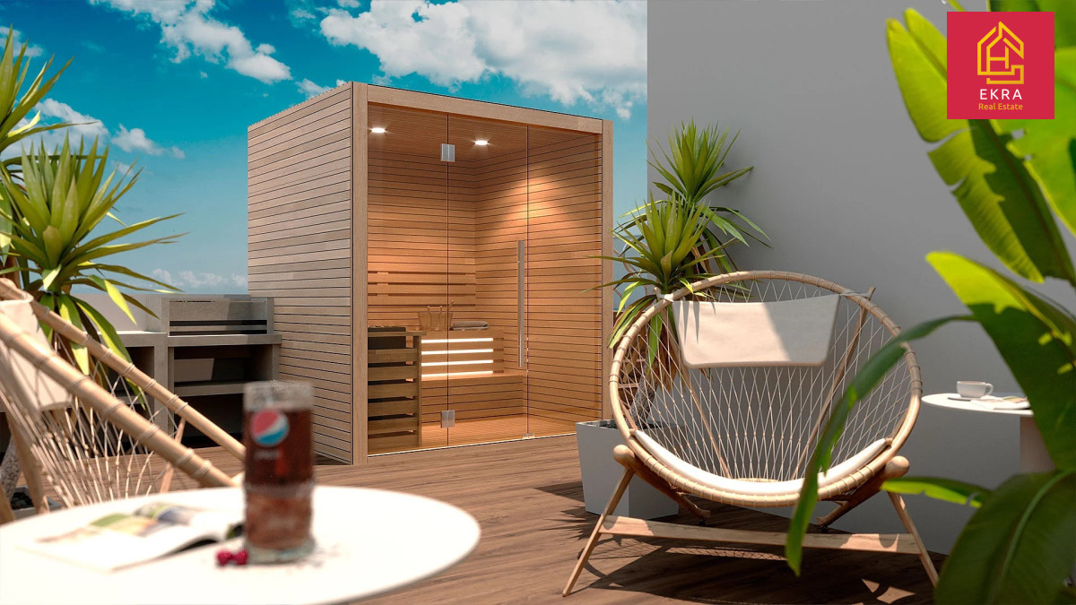 Relaks na dachu: Do dyspozycji mieszkańców oddajemy prywatne solarium z basenem i sauną, skąd roztacza się kojący widok na morze.