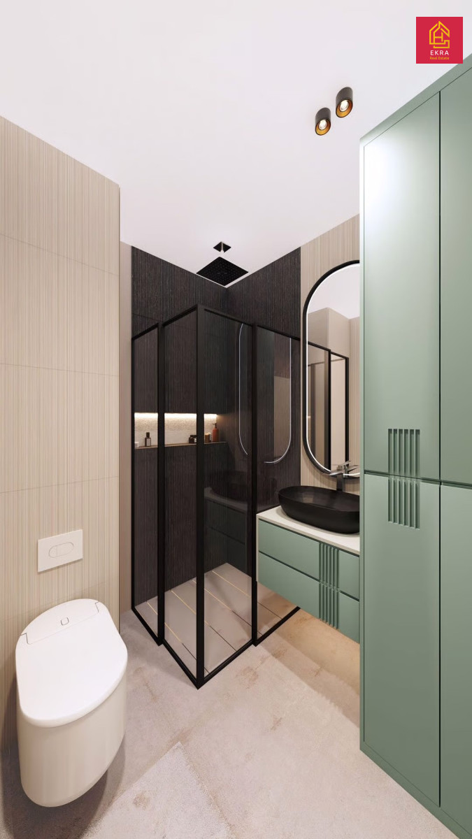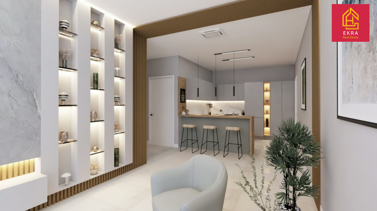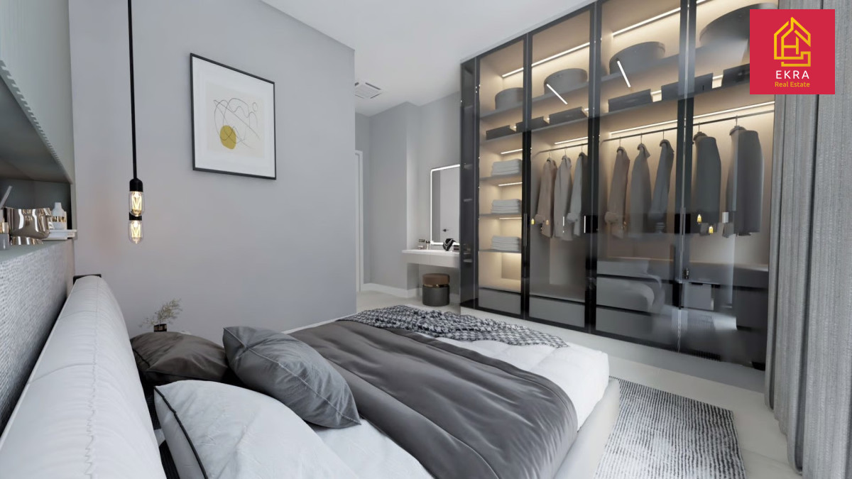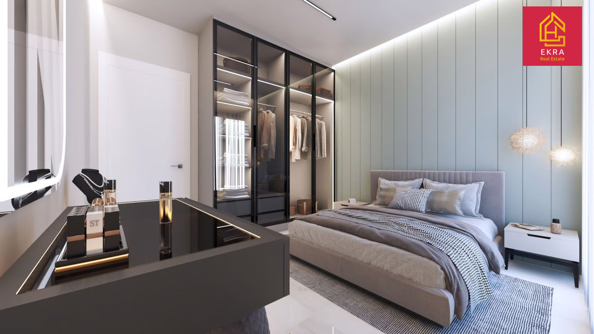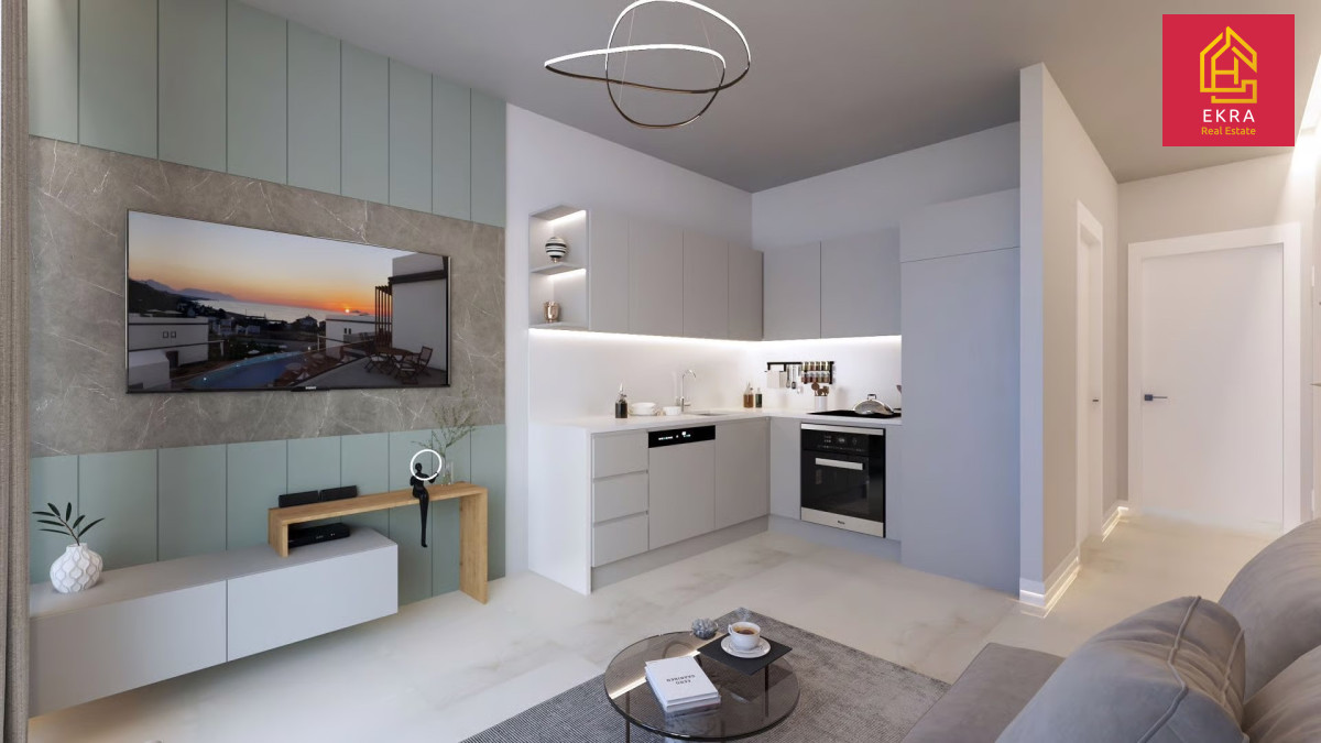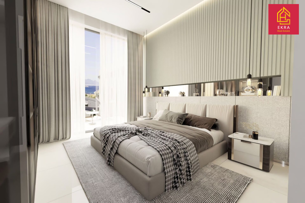 Na sprzedaż nowoczesny apartament 1+1 o powierzchni 40,02 m² z przestronnym balkonem 12,2 m², zlokalizowany w ekskluzywnym kompleksie mieszkaniowym na drugiej linii zabudowy od Morza Śródziemnego, zaledwie 250 metrów od piaszczystej plaży.