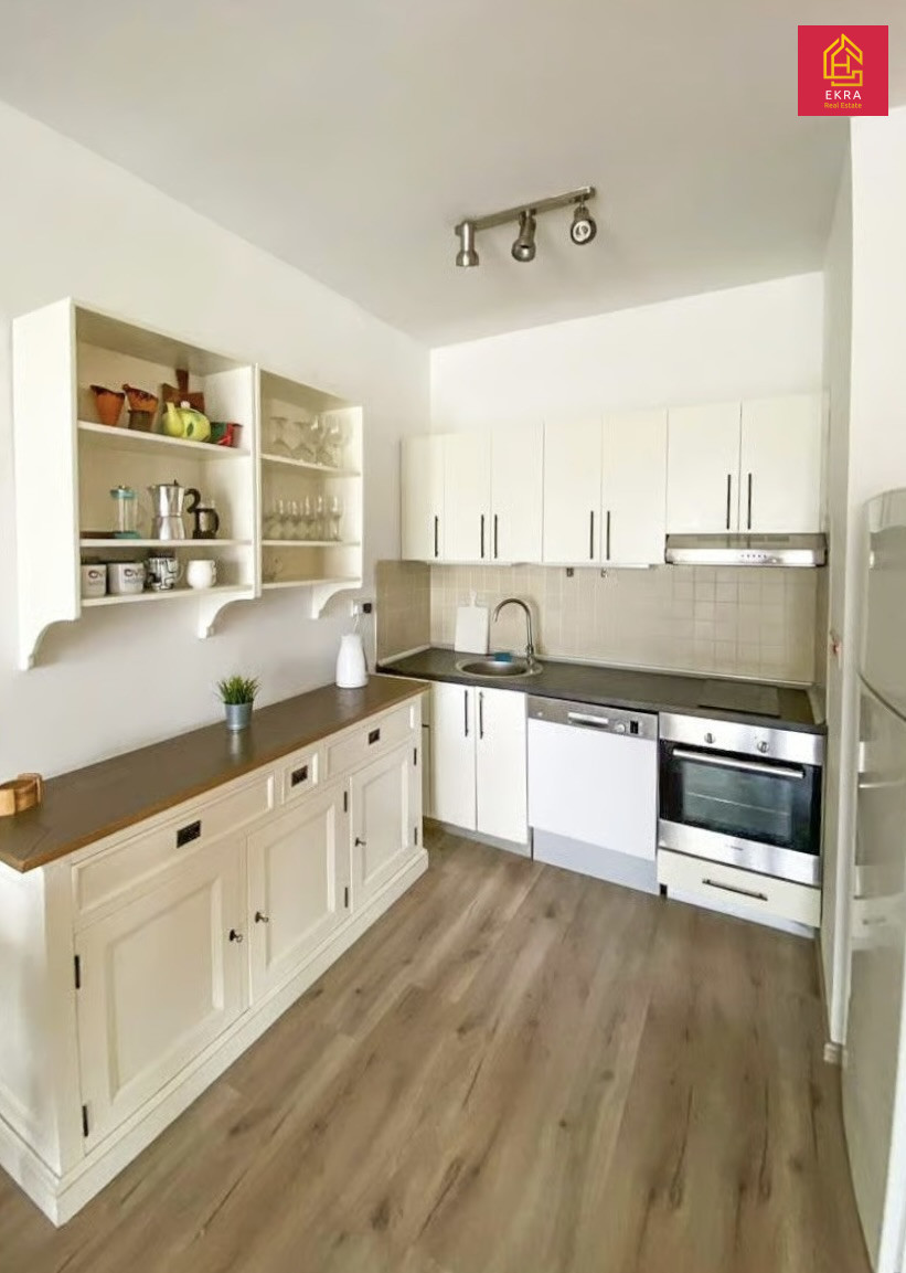 - Kuchnia wyposażona jest w niezbędny sprzęt AGD: płytę grzewczą, piekarnik, okap, lodówkę oraz zmywarkę.
