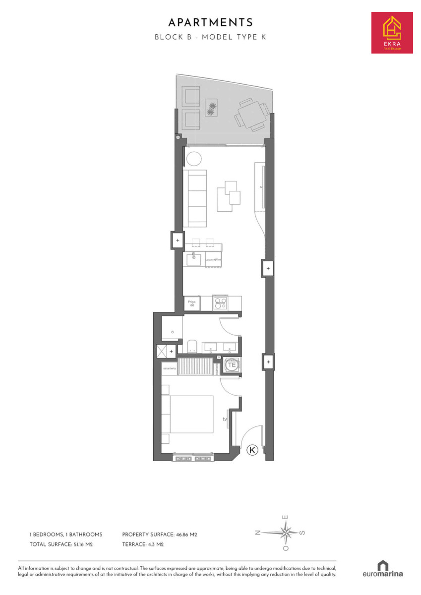 - Powierzchnia użytkowa (salon + kuchnia): 46,86 m²