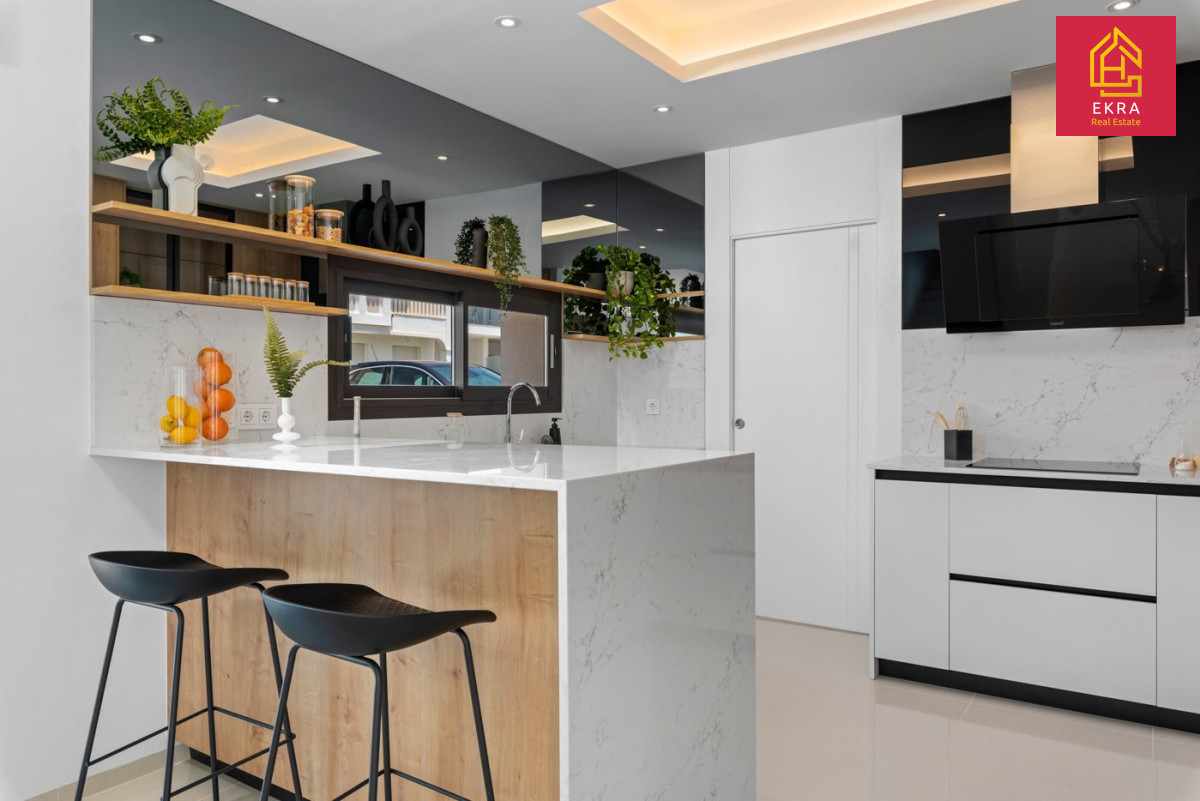 Otwarty salon-jadalnia połączony z nowoczesną kuchnią