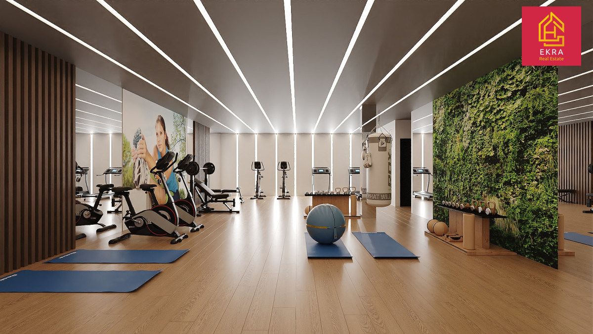 dwa wspólne baseny, ogrody krajobrazowe, plac zabaw, recepcja, kawiarnia, centrum fitness, klub rekreacyjny, kort tenisowy, boisko do piłki nożnej, boisko do siatkówki